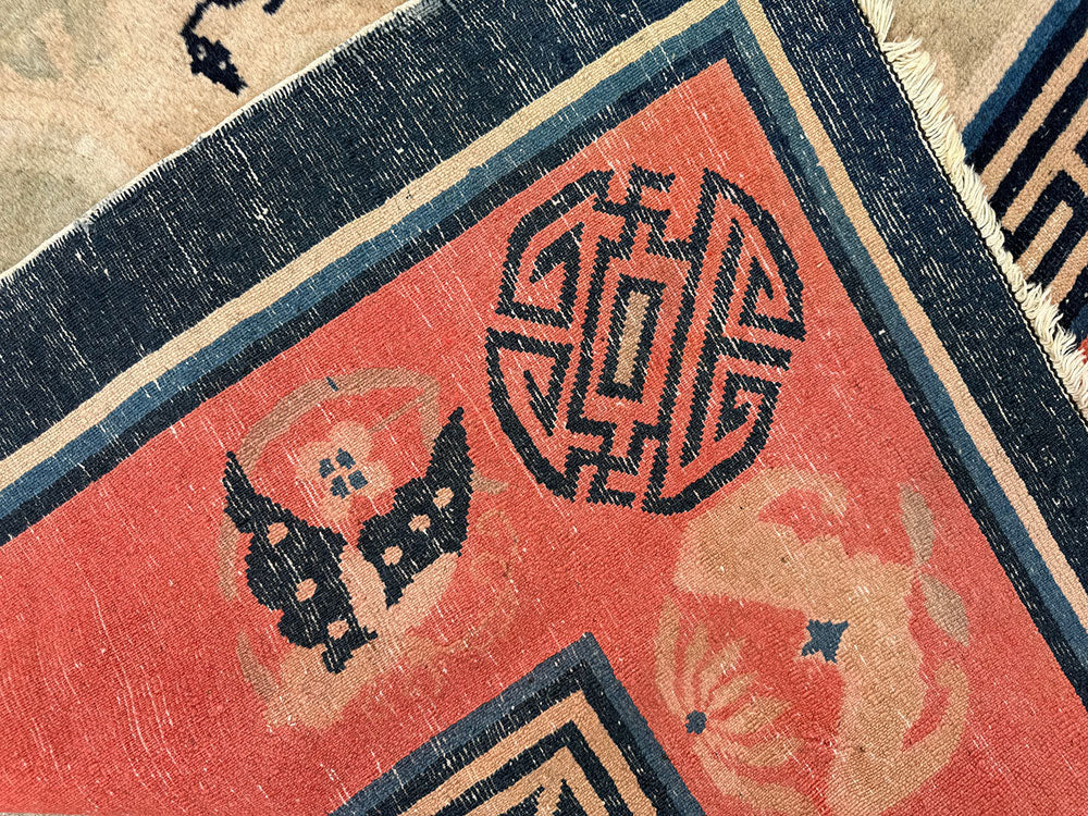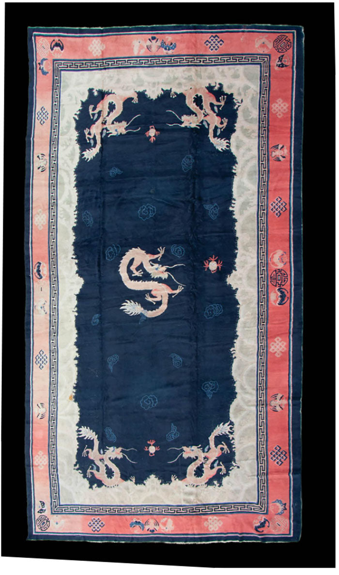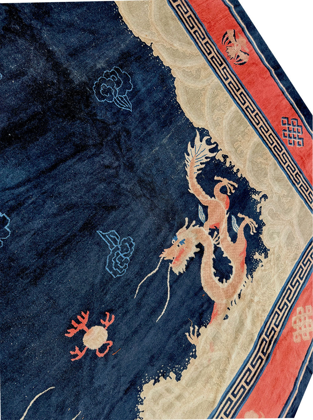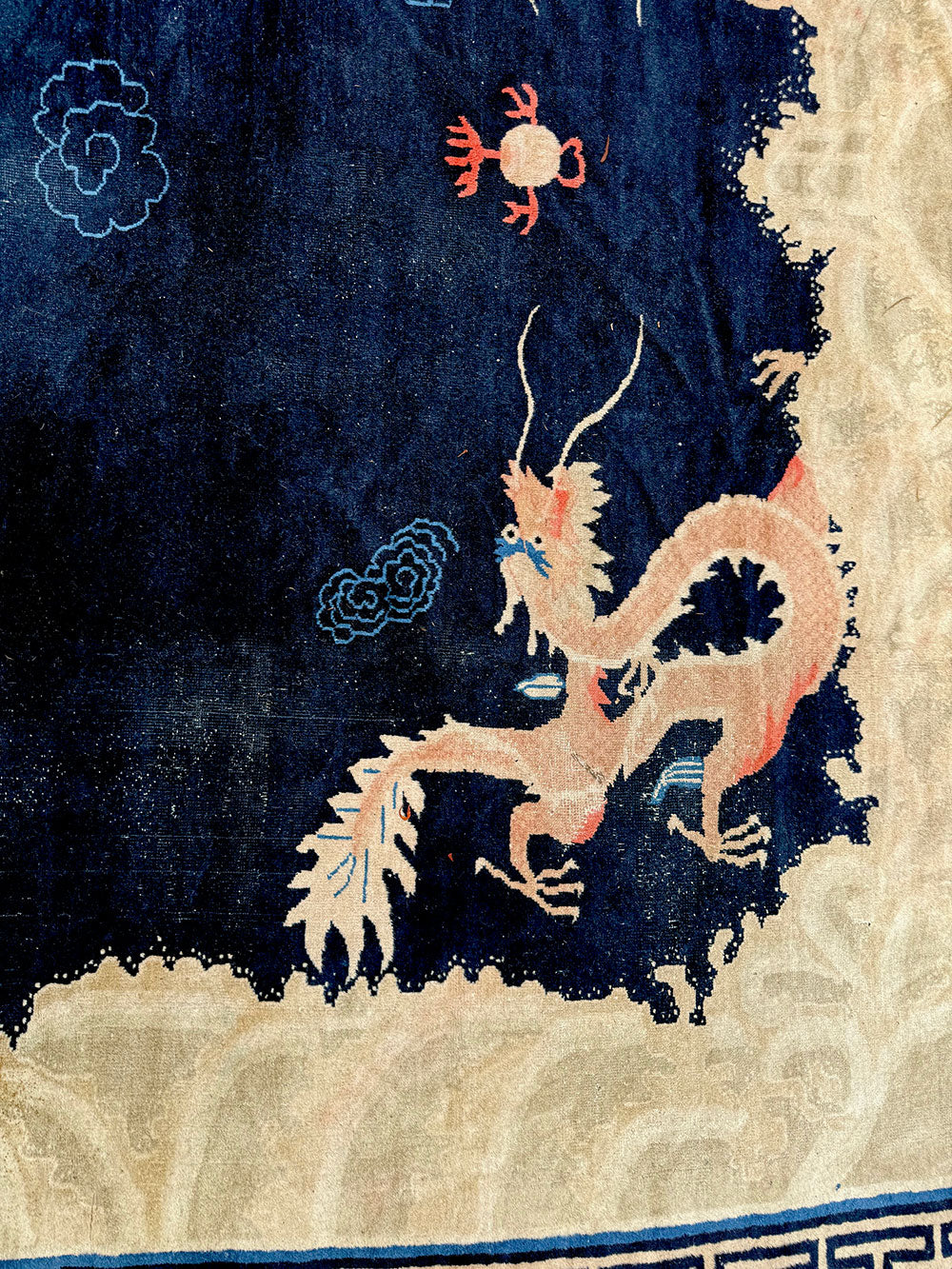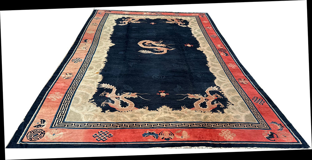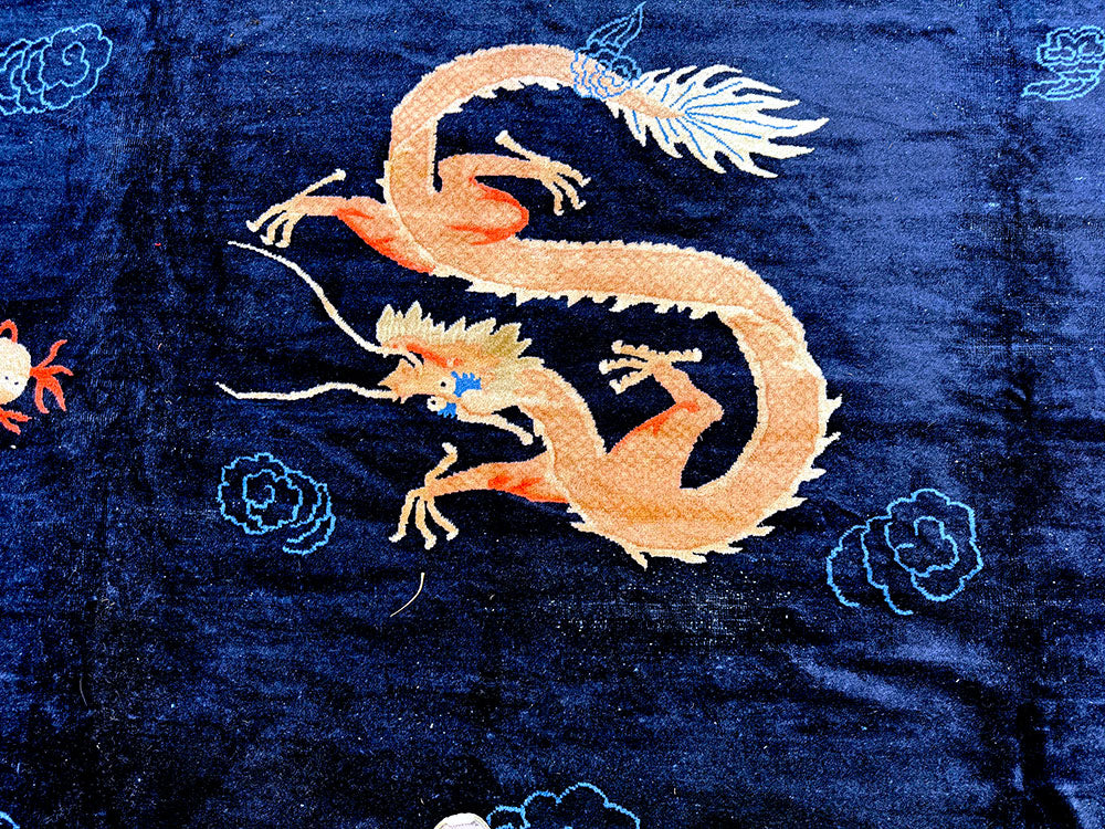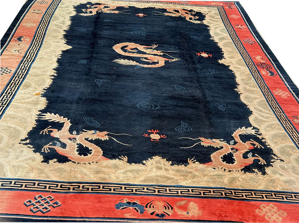 East Asia, China, Qing Dynasty, ca. late 19th to early 20th century CE. A large and exquisite hand-knotted Peking wool rug adorned with traditional Chinese dragon imagery and auspicious motifs. Four clawed dragons pursue flaming orbs, their dynamic forms echoing celestial battles. The red border is richly decorated with symbolic emblems including fu bats, butterflies, infinity knots, and shou (longevity) symbols. The indigo ground features rolling white waves and cloud motifs in soft blue hues, suggesting a heavenly realm. At either end, pairs of dragons chase after flaming pearls, while a central dragon chases one of its own. In Chinese tradition, the flaming pearl symbolizes spiritual energy, wisdom, prosperity, power, immortality, thunder, and the moon. The recurring motif of dragons contesting over the pearl reflects a pursuit of power and enlightenment. Size: 230" L x 146" W (584.2 cm x 370.8 cm)'
