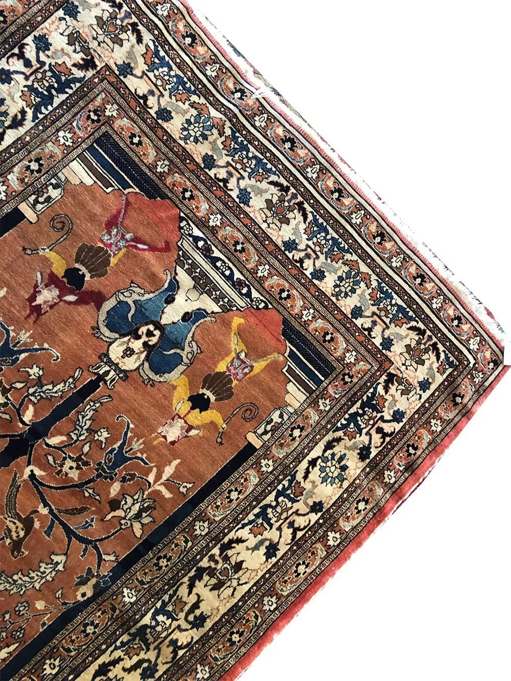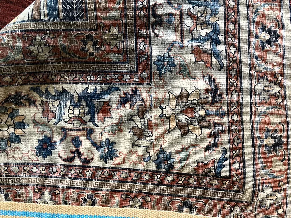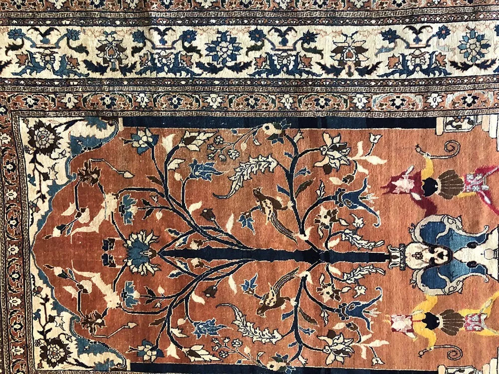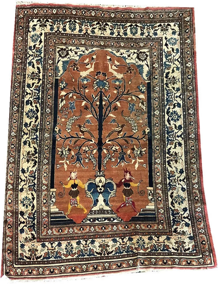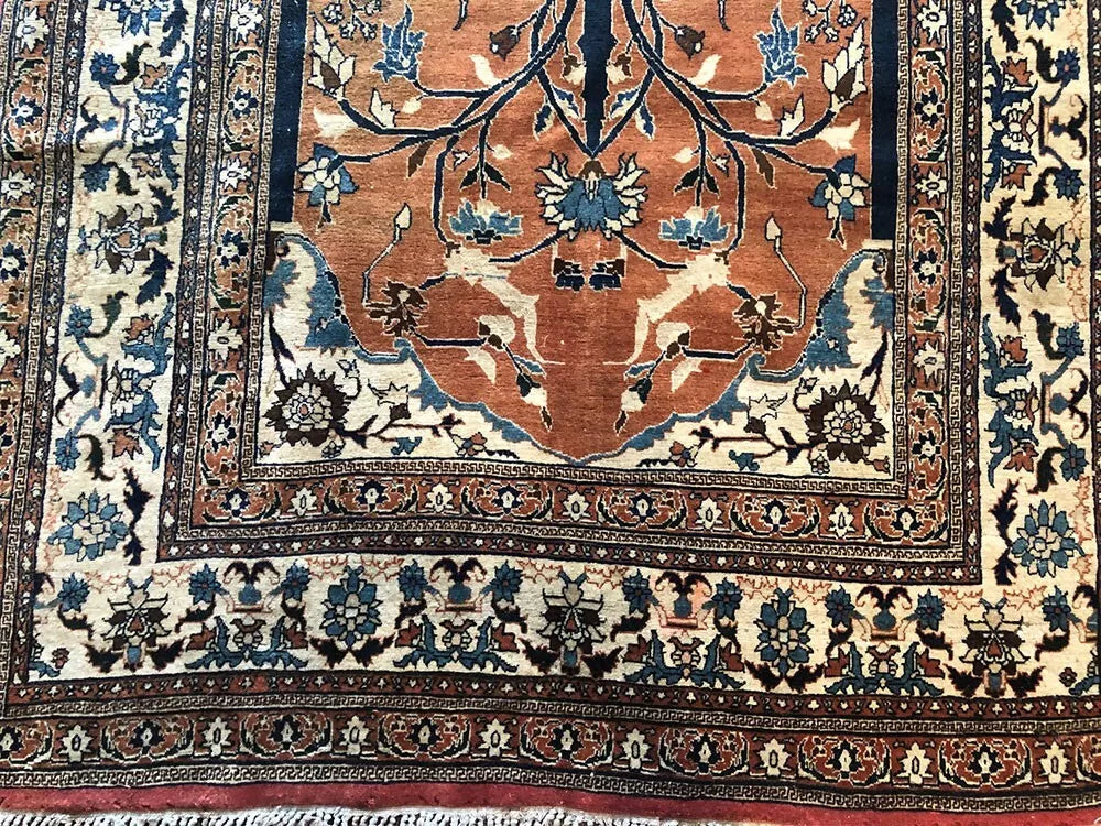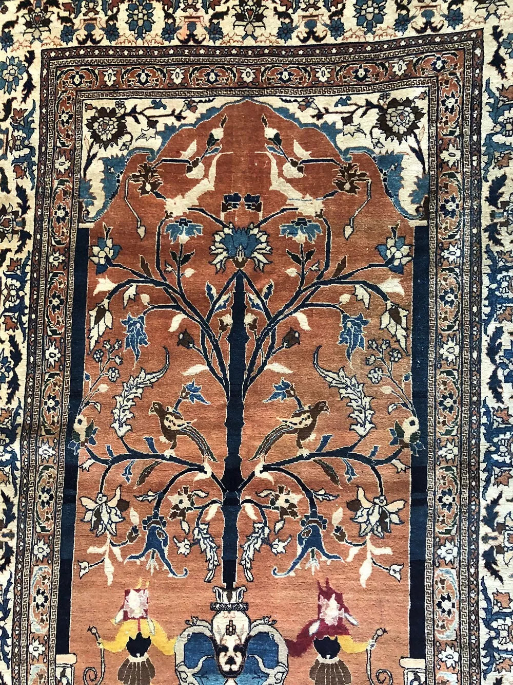 Wow, this is a genuine Haji Jalili with very interesting tree of life pattern, This rug is nearly 140 years old, and is in good condition being almost century & half old. Of course, it has low even flat pile, shows some minor wear but no cracks, stiffness, hole, and stain. One thing , which is very interesting there are two dimen at the bottom of the tree right & left with horns in the head. I am not sure what is the story behind it and I welcome any feedback. This is a true unique item, it also could be used as a hanging piece. Thisis a type that always appreciates in value. For folks who are not familiar with Haji Jalili Tabreez rugs, I would say Haji Jalili is among the most expensive antique rugs and they are in luxury category or class.