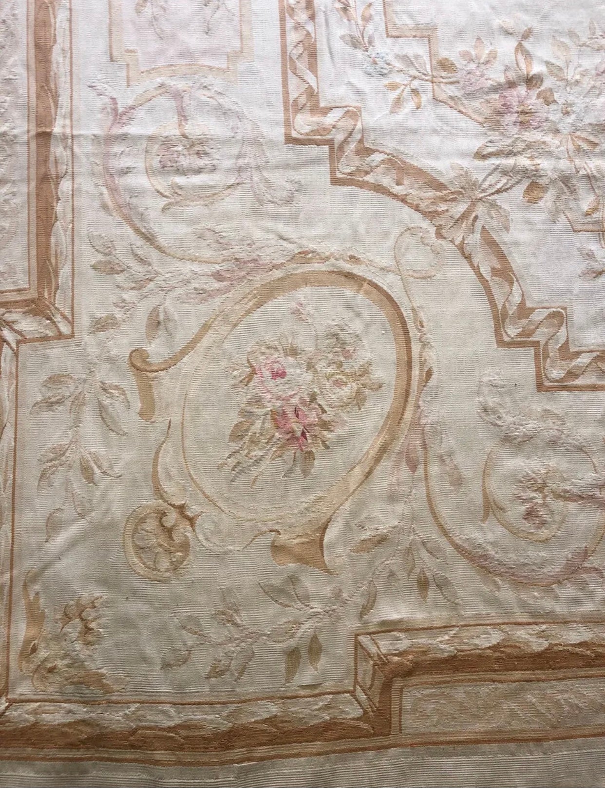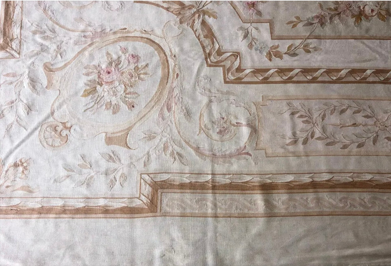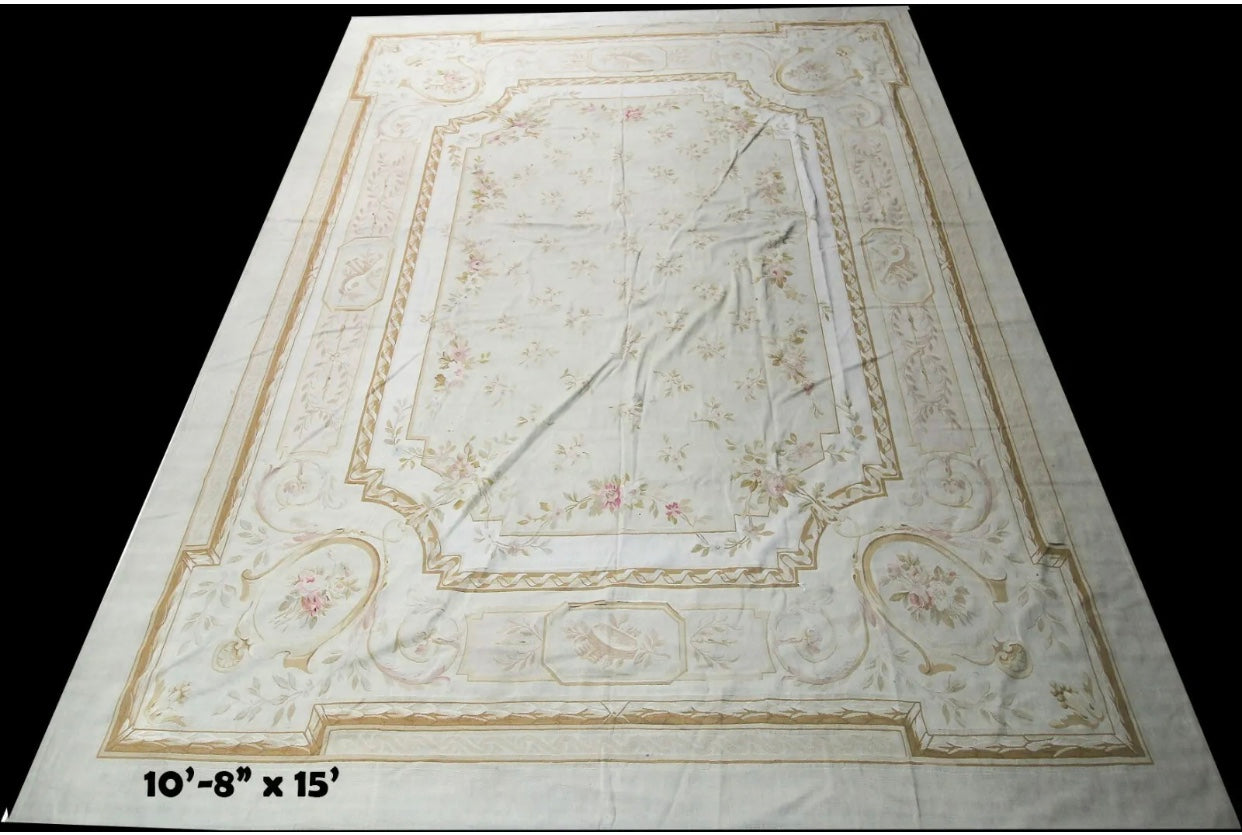 For those whom are not familiar with French Aubusson I like to bring to your attention that Aubussons are Flat Weave. Usually, when we come cross French Aubussons at this age or higher we see some condition problem such visible foundation threads, stain, repair and not clean. But in this case, I was so amazed that I found a 140 years old French Aubusson without any problem whatsoever. It was so lucky , also future buyer. I spotted this from an estate sale from a mansion in Los Angeles, whole place was decorated absolutely Victorian and this was laid down in their dining room. Another Advantage about this, nice earth tone color combination and of course measures 10’-8” x 15’ . Something like this at this age , condition, and size easily could have a 5 figures price tag at retailers but you have a golden opportunity to steal it at $2,999.00 .