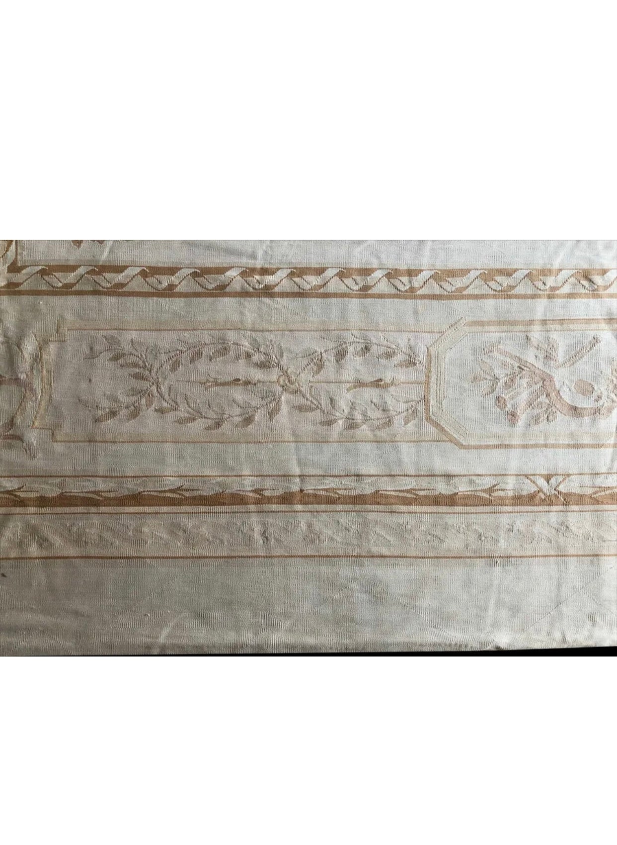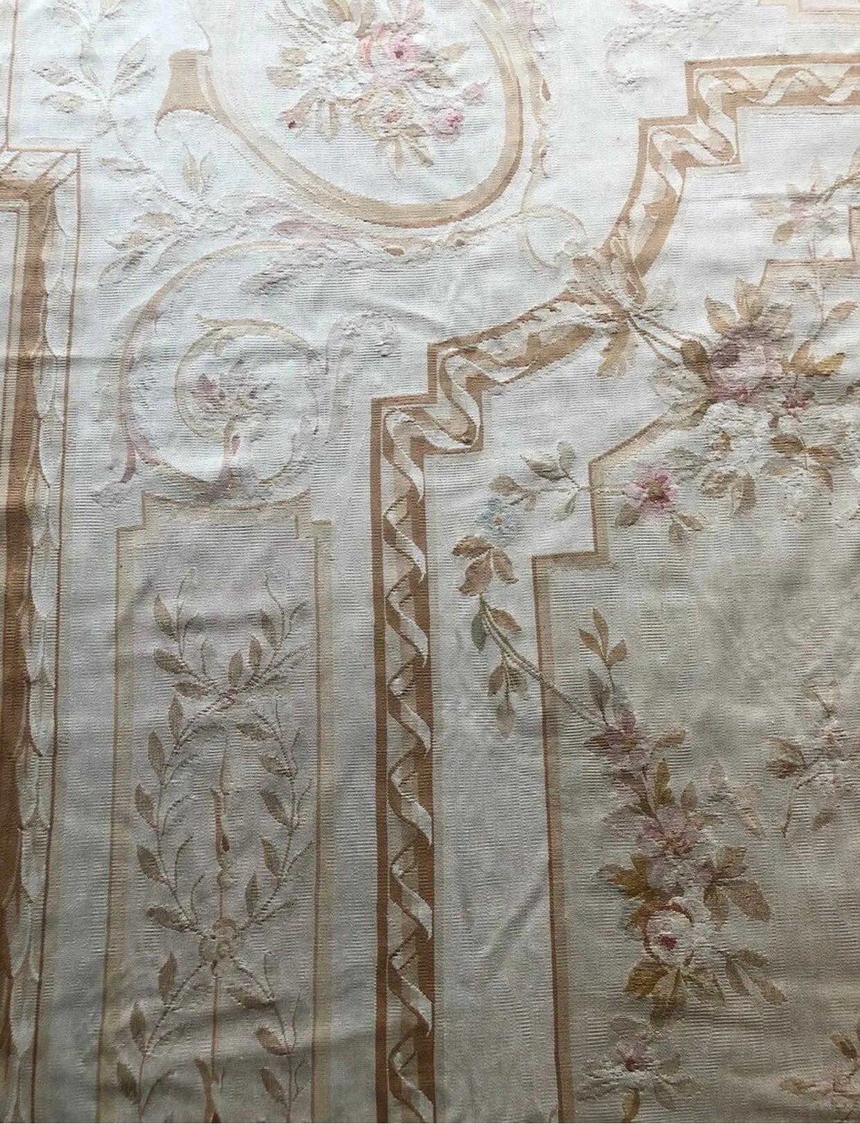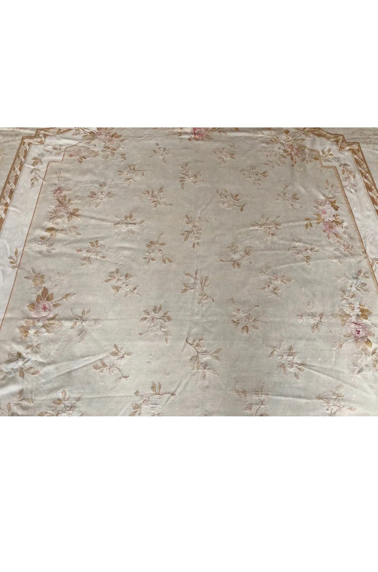For those whom are not familiar with French Aubusson I like to bring to your attention that Aubussons are Flat Weave. Usually, when we come cross French Aubussons at this age or higher we see some condition problem such visible foundation threads, stain, repair and not clean. But in this case, I was so amazed that I found a 140 years old French Aubusson without any problem whatsoever. It was so lucky , also future buyer. I spotted this from an estate sale from a mansion in Los Angeles, whole place was decorated absolutely Victorian and this was laid down in their dining room. Another Advantage about this, nice earth tone color combination and of course measures 10’-8” x 15’ . Something like this at this age , condition, and size easily could have a 5 figures price tag at retailers but you have a golden opportunity to steal it at $2,999.00 .
